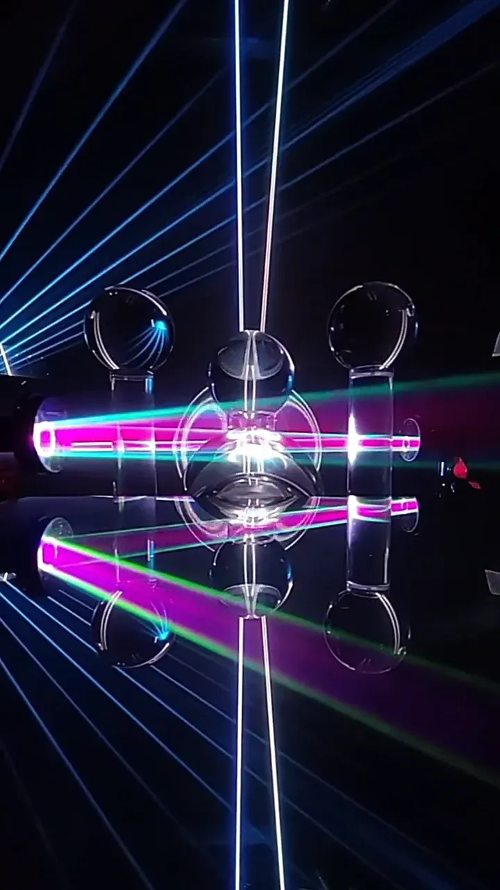 Crazy optical combinations of a concave mirror and a crystal ball + 1 laser projectors (the white beams)